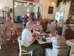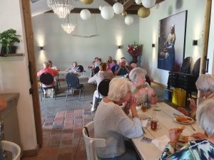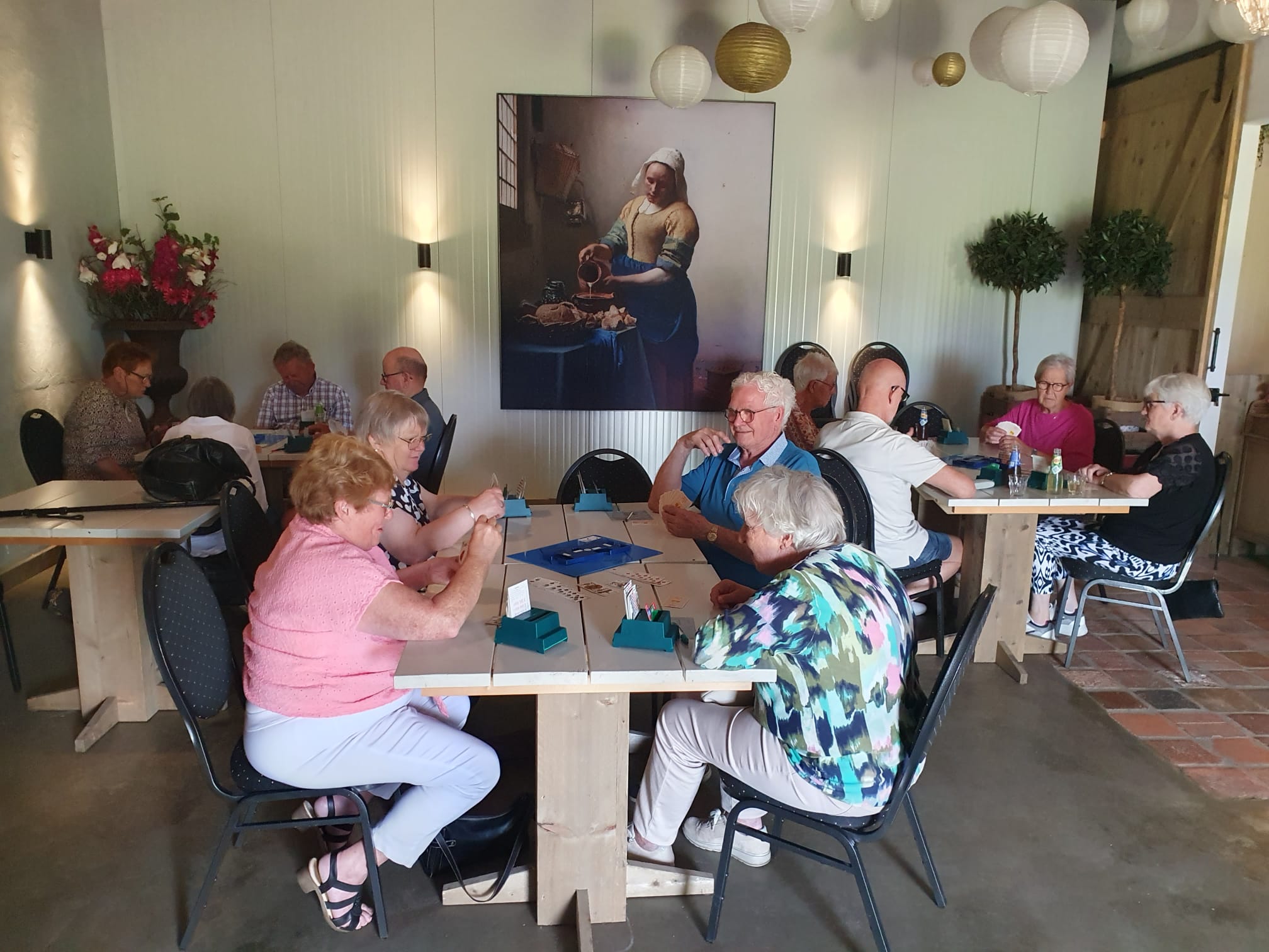 In de ochtend troffen we elkaar bij het Drieske in Hulsel. He was meteen gezellig en er werd volop gekletst onder het genot van een lekker bakkie koffie/ thee. Maar we waren er ook om te bridgen. Dus op naar de kleine zaal waar alles voor het bridgespel al klaar stond. Verdeeld over 6 tafels speelden we onze spellen, 2 rondes van elk 4 spellen, en tussendoor nog een lekker bakske. Hierna op de fiets, via een toeristische route, naar Fabor, de ijsboerderij in Reusel. Hier stond een heerlijke lunch voor ons klaar. Waarna er weer gebridged kon worden. Na afloop mocht een lekker ijsje natuurlijk niet ontbreken, wat we op het terras verorberden. Hierna fietsten we naar Bojo’s in Lage Mierde. daar werden de laatste 8 bridgespellen gespeeld.